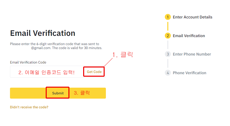 5. Get Code를 클릭하여 인증코드를 이메일로 받은 뒤 입력 후 Submit을 눌러줍니다.