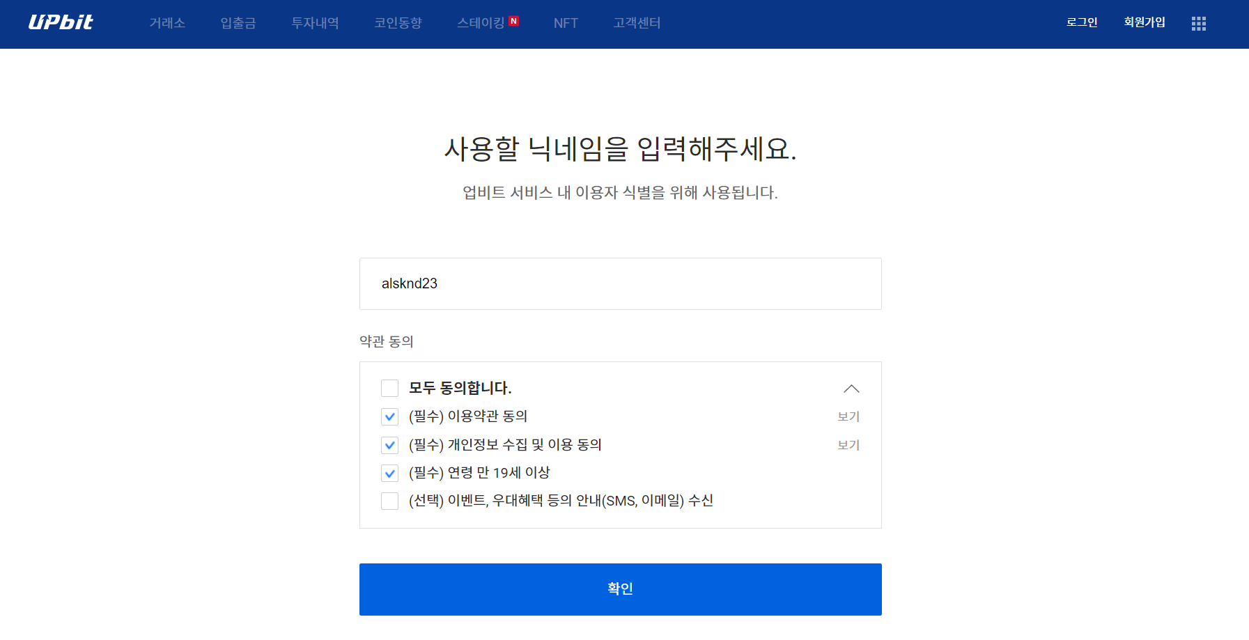 6. 동의를 완료한 후 업비트에서 사용할 닉네임을 입력합니다. (별로 중요하지 않음..)