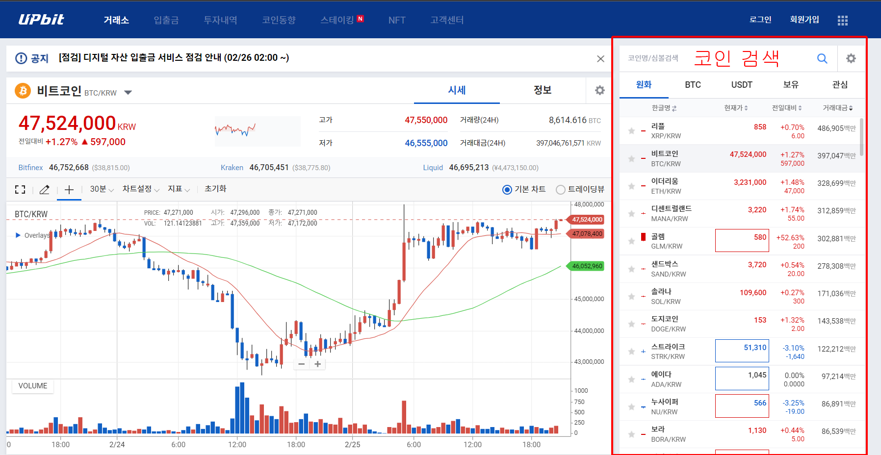3. '업비트'에 상장되어있는 코인 중 확인하고 싶은 다른 코인이있다면 '코인 검색' 부분에 코인명을 입력해주시면 됩니다.