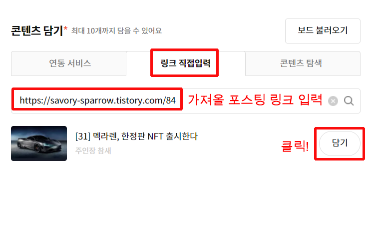 - 마음에 들었던 포스팅의 링크를 입력 후 '담기' 클릭!