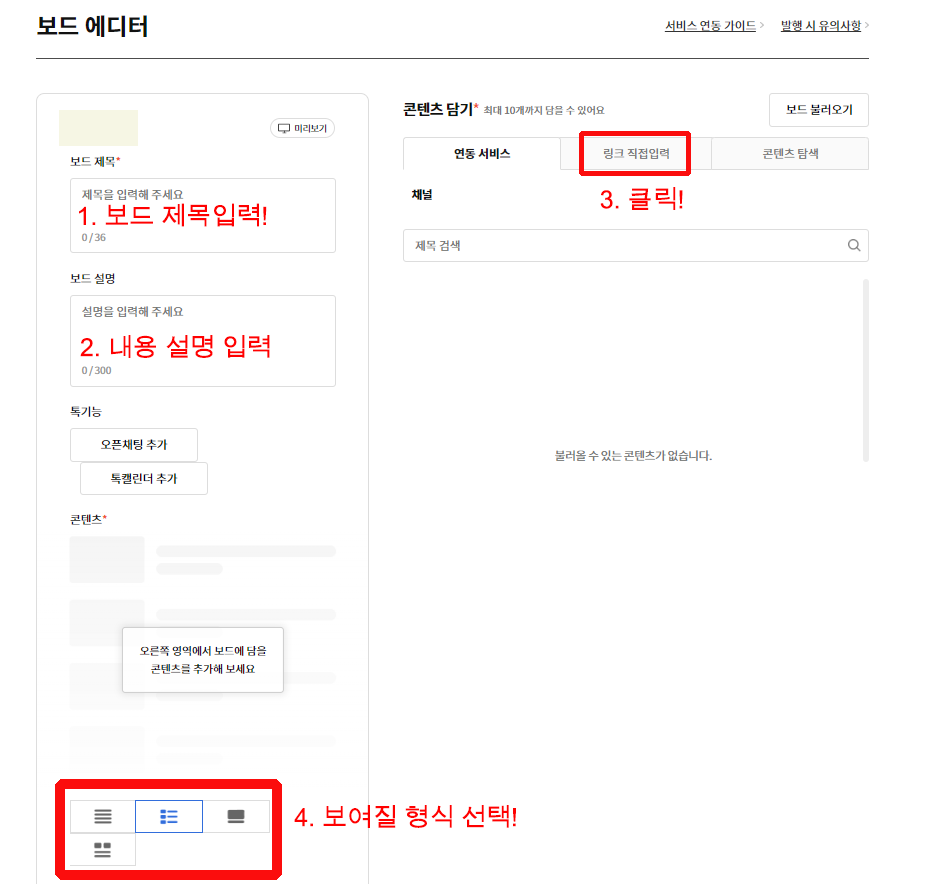 3. 콘텐츠 담기 : 연동서비스, 링크 직접입력, 콘텐츠 탐색 중 1가지를 선택합니다.