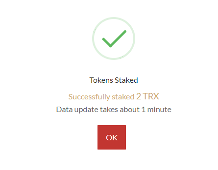 5. 성공적으로 스테이킹이 완료되었습니다! OK 버튼을 누르시면 됩니다.