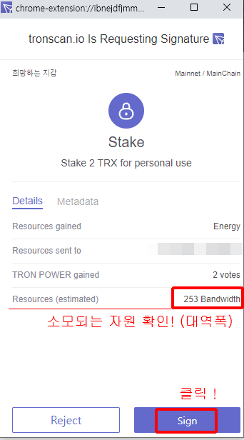 4. Stake를 누르면 최종 승인 팝업이 뜨게 됩니다. 여기서 'Sign'을 클릭!