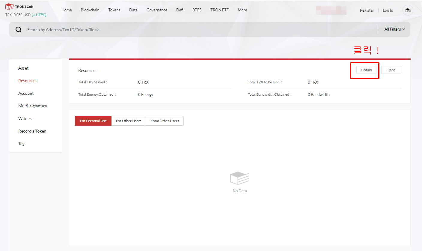 6. 트론링크에서 '새로고침' 버튼을 누르면 에너지가 들어온 것을 확인할 수 있습니다!