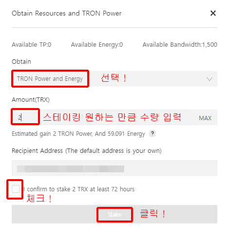 본인이 스테이킹한 TRX 개수만큼 비례해서 에너지 or 대역폭이 충전됩니다.