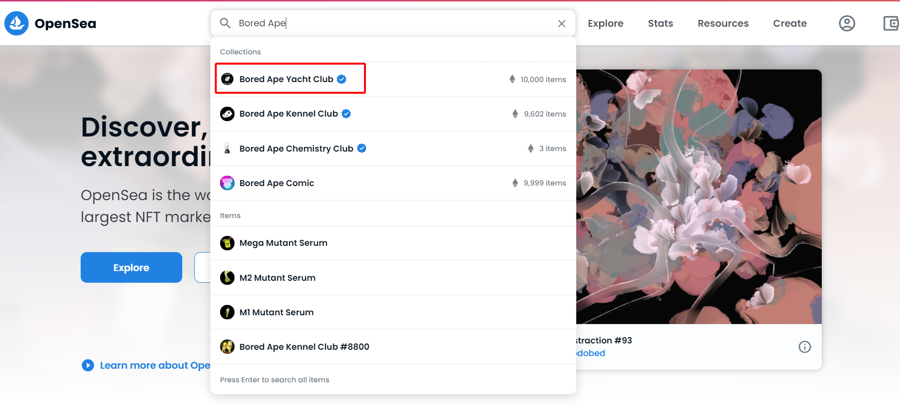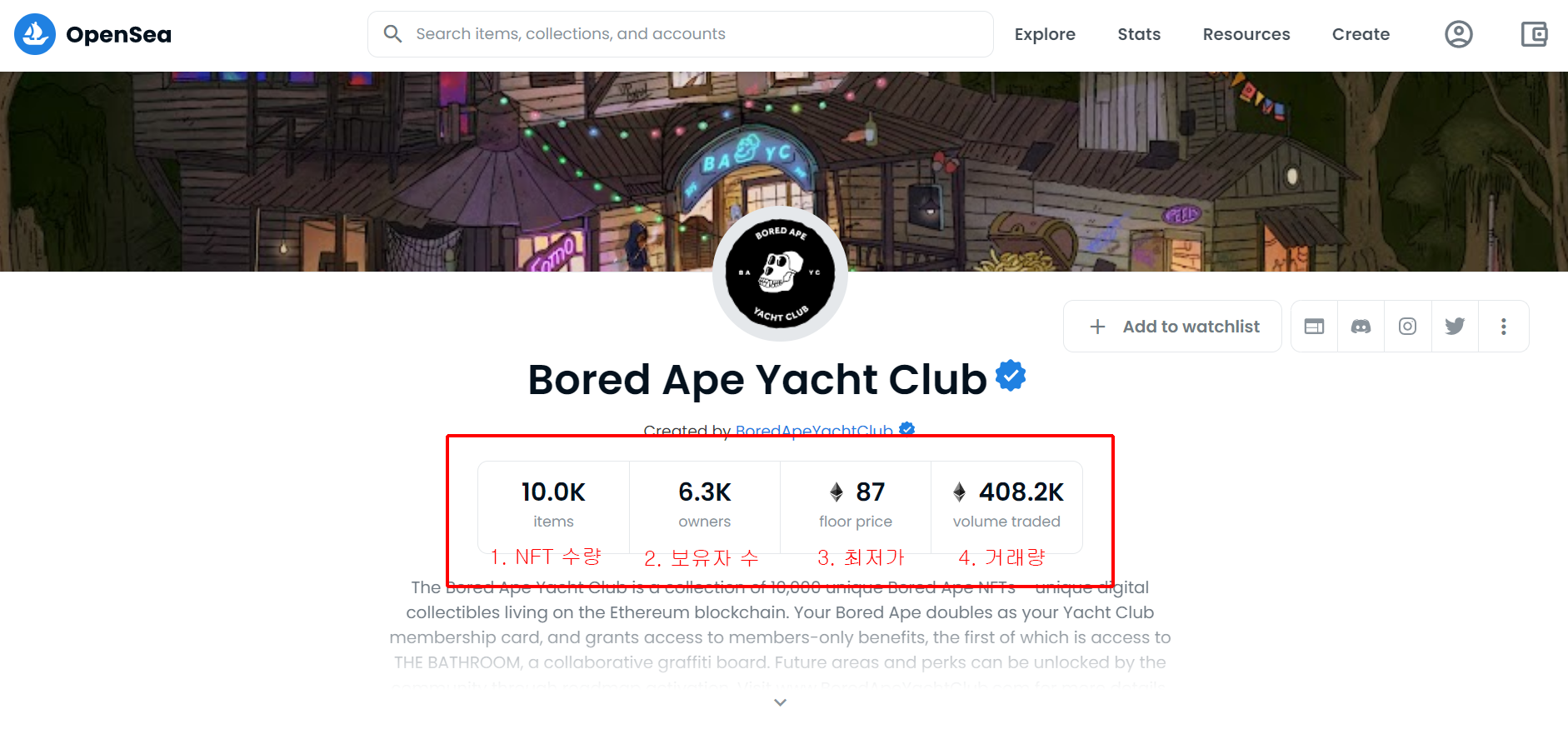 4. 세계적으로 상당히 유명하고 비싼 'Bored Ape Yacht Club' NFT를 볼까요?
