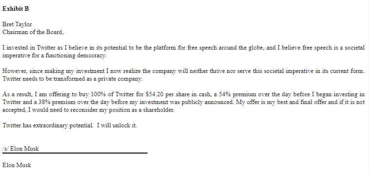 54.20$(달러)에 트위터의 주식 100%를 구매하는 것을 제안한다.