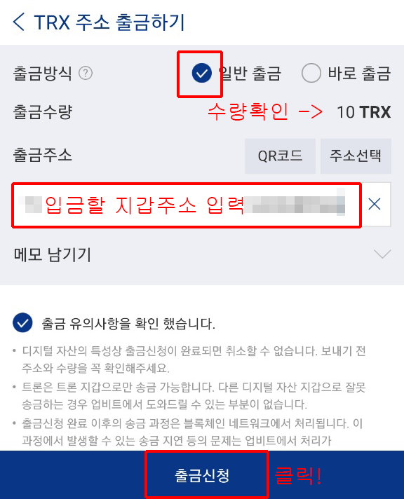 '바로 출금'은 업비트 계정 간 송금 시에만 사용 가능하기 때문에