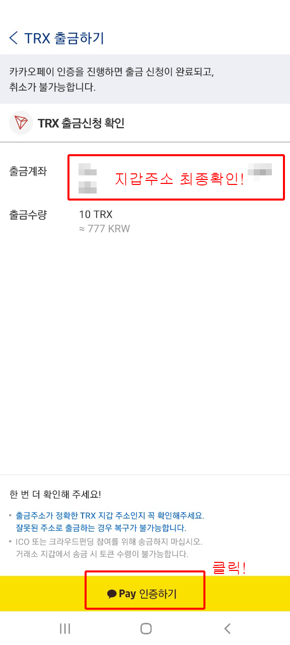 5. 출금신청 내역 확인 후 '카카오페이' 인증하기 클릭!