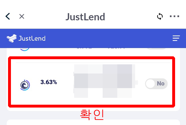- JustLend로 이동하기 위해 이미지에 체크된 동그라미를 클릭해줍니다.
