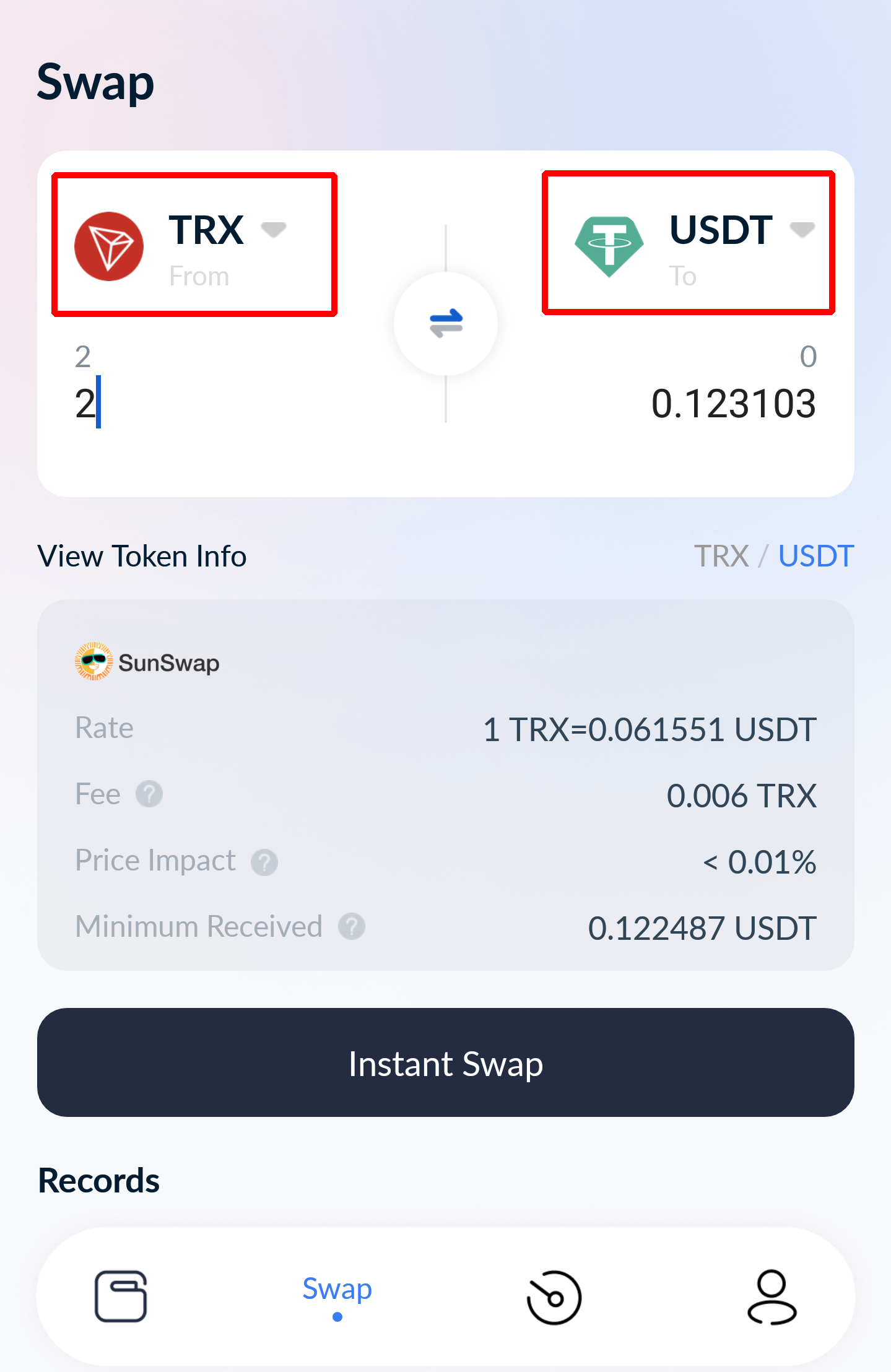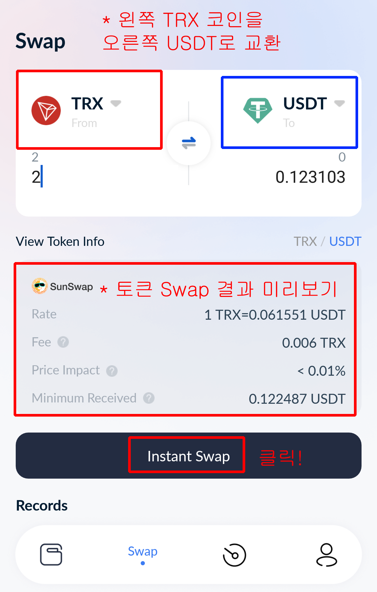 - View Token Info부분에 예상 Swap결과 확인 후 Instant Swap 클릭!