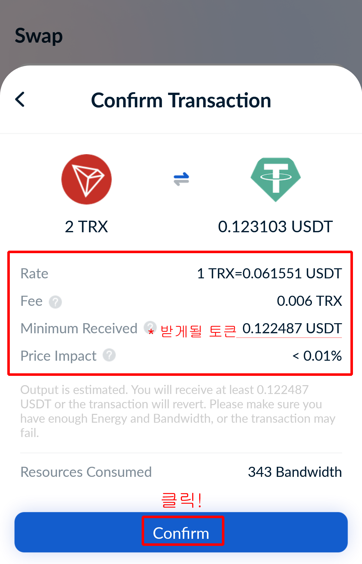 4.  Minimum Received 확인 후 Confirm 클릭!