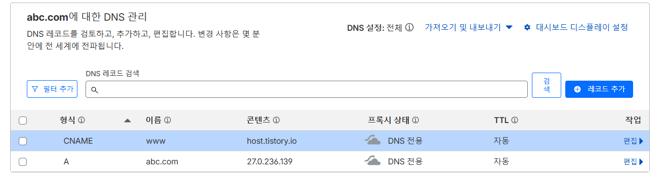 www 주소를 티스토리로 연결하는 설정입니다.